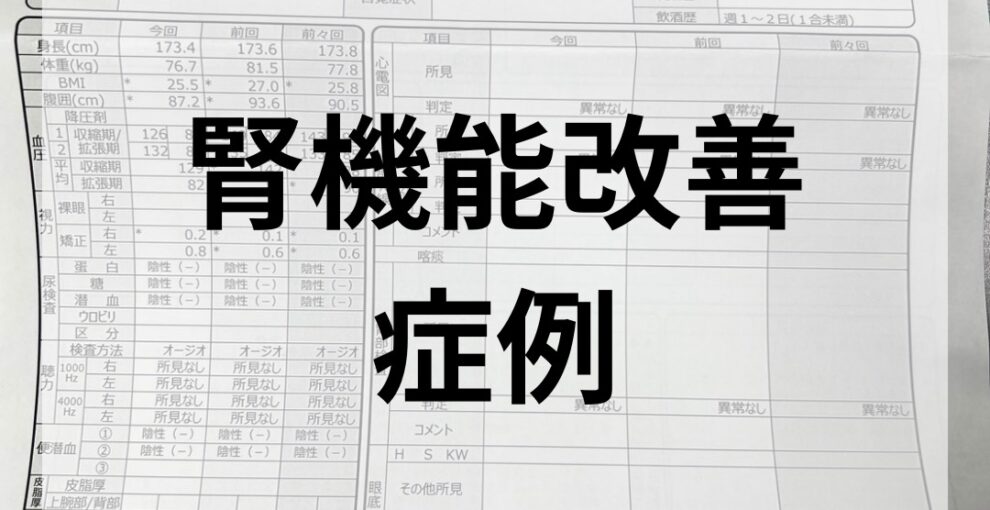 まず、腎機能の指標であるクレアチニンは1.02→0.98へ低下。それに伴い、eGFRは61.8→64.2へと上昇し、改善が見られました。