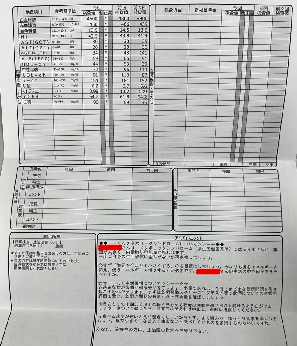 前回の健診結果と比較して、驚くほど数値が回復しています。